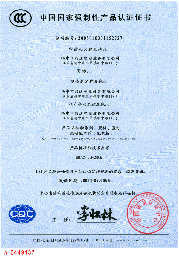 • 照明配電箱(配電板)PZ30-63A-25A中國國家強制性產(chǎn)品認證證書