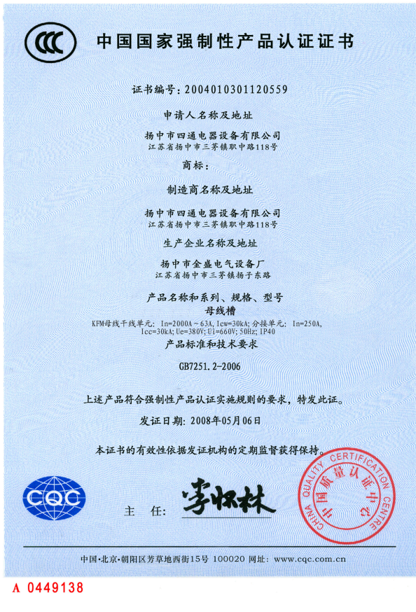 • 母線槽KFM中國國家強制性產(chǎn)品認證證書