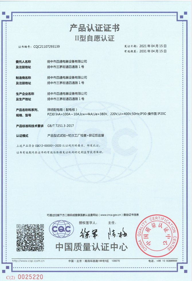 • 照明配電箱(配電板)PZ30-100A-10A產(chǎn)品認證證書