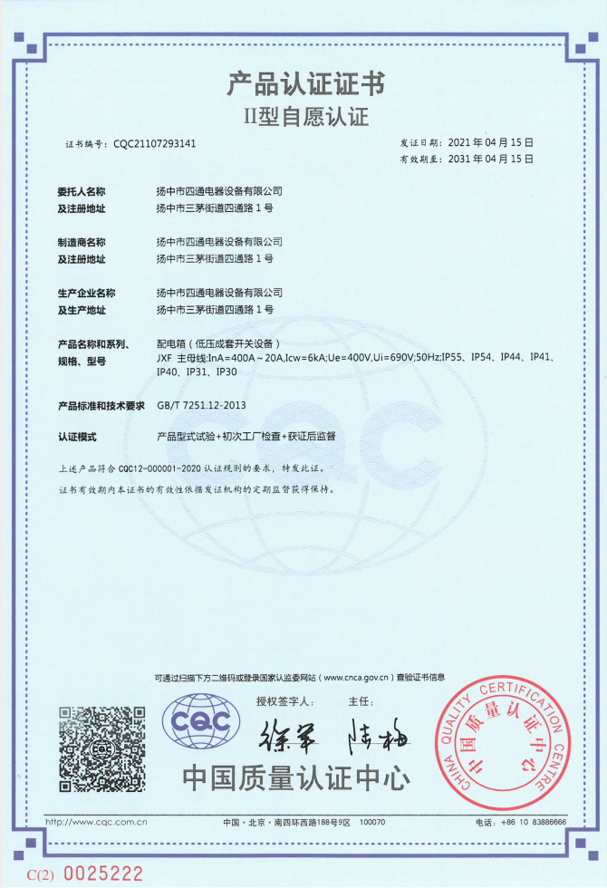 • 配電箱(低壓成套開關(guān)設(shè)備)JXF400A-20A產(chǎn)品認證證書