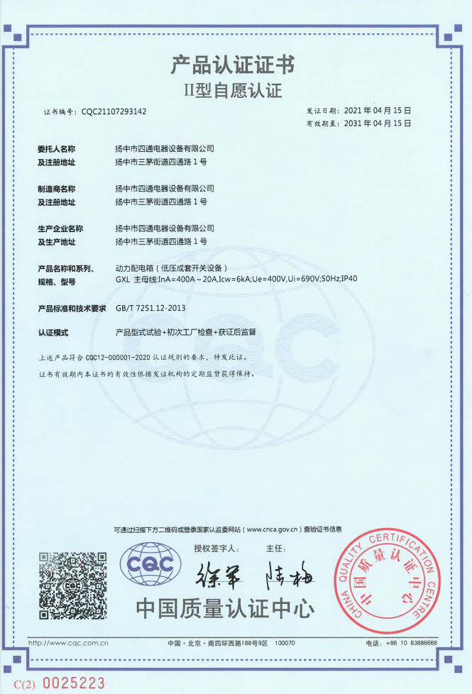 • 動力配電箱(低壓成套開關(guān)設(shè)備)GXL400A-20A產(chǎn)品認證證書